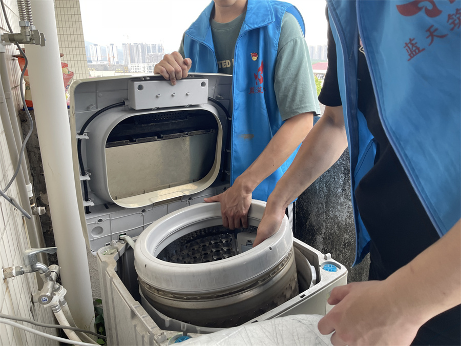 志愿者们拆卸洗衣机