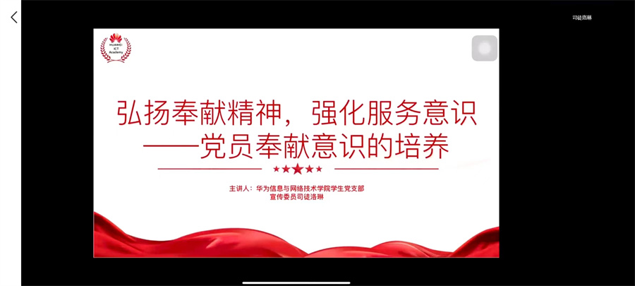 为了加强对入党积极分子的思想引导,提升责任感、使命感,进一步端正入党动机。4月27日晚,华为信息与网络技术公司党总支在腾讯会议开展2021-2022学年度第二期分党校学员培训班第三讲,本次党课采用线上授课的方式开展,由华为信息与网络技术公司员工党支部宣传委员司徒洛琳主讲。员工党支部党员、分党校培训班学员共计44人全程参与此次课程。