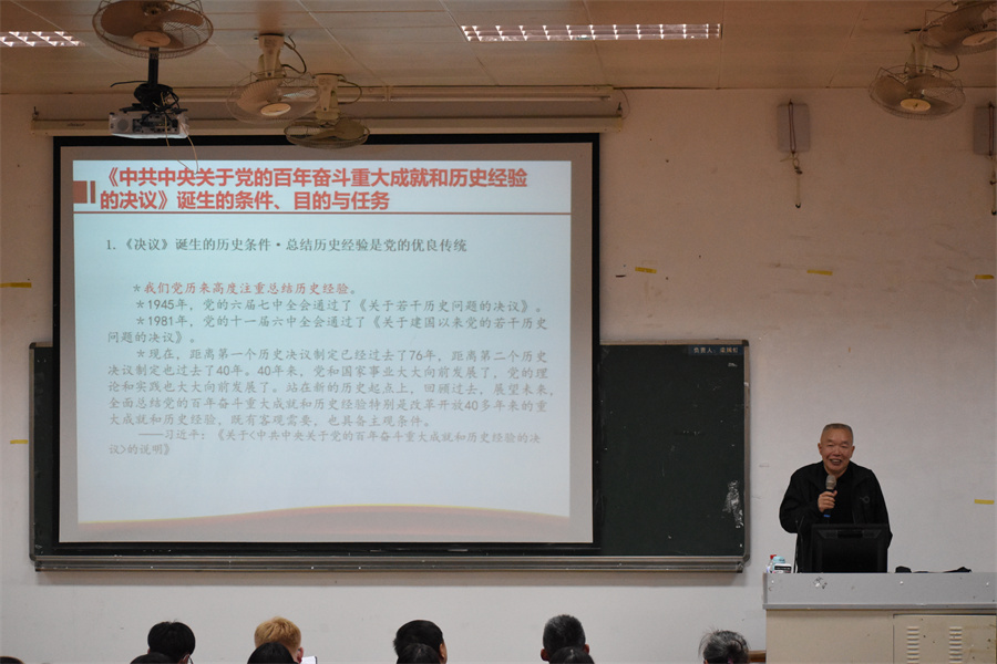 郑先兴教授以“勿忘昨天的苦难辉煌,无愧今天的使命担当,不负明天的伟大梦想”为主题,就2021年11月11日中国共产党第十九届中央委员会第六次全体会议通过的《中共中央关于党的百年奋斗重大成就和历史经验的决议》(以下称决议)进行讲解。郑教授通过决议诞生的条件、目的与任务,决议的内容,决议的特征,决议的意义,决议的历史启航模块宣传讲解了党的十九届六中全会精神。