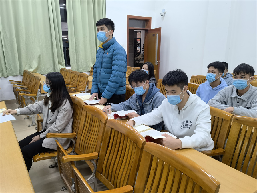 课上,胡富铭从党的十九届六中全会决议内容方面进行授课,着重从“赶考精神”方面进行讲述。他举例说明,传承赶考精神,需坚持不忘初心和不断改革创新。正如新冠疫情爆发时,习近平总书记作出的“人民群众的生命健康高于一切”的重要指示,各级党员干部以身作则,冲在抗疫一线,不惧病毒风险,用生命捍卫人民的利益,用实际行动向人民保证,为人民服务,始终是我党不变的初心;在刚刚完成的脱贫攻坚任务中,“互联网脱贫”正体现了各级政府的改革创新。胡富铭在讲课中指出,作为新时代青年,一定要牢记初心使命,增强忧患意识,始终保持赶考的清醒和坚定,以一往无前的奋斗姿态和风雨无阻的精神状态,顽强拼搏、不懈奋斗,继续考出一个好成绩,不断展现新气象新作为,向人民、向历史交出一份更加优异的答卷。