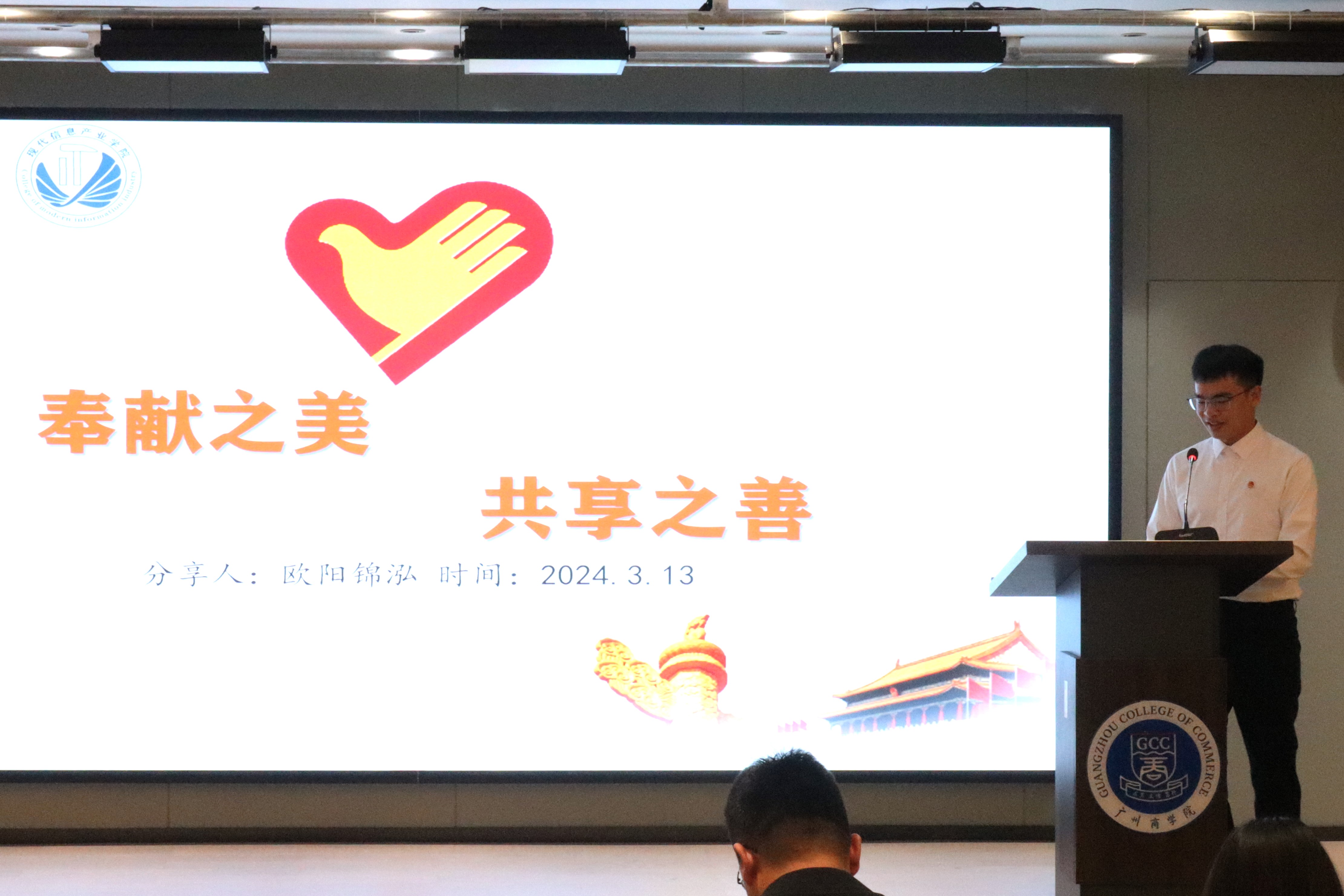 星级志愿者欧阳锦泓通过“返家乡”社会实践活动、暑期“三下乡”社会实践活动、社区服务分享了在志愿服务过程中的经历与深刻的感悟。他深入参与多种不同形式的志愿服务,通过各种事例声情并茂展示过程的收获。他认为尽管个人力量有限,但众志成城可产生巨大能量,同时呼吁更多的年轻人加入志愿服务,共同推动志愿服务发展与和谐社会构建。