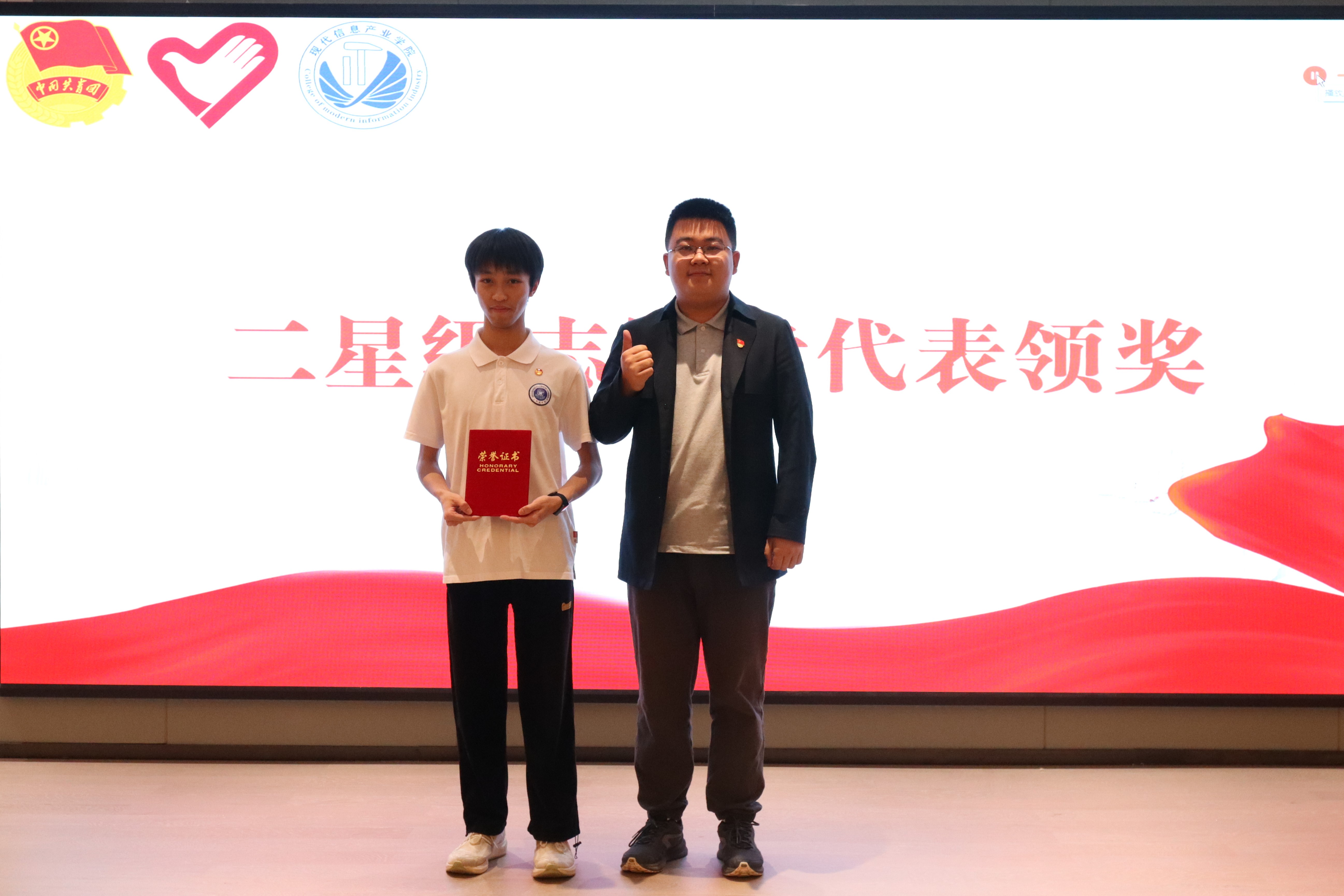 此次活动分为星级志愿者分享、星级志愿者颁奖、志愿者宣誓以及老师讲话四个环节。星级志愿者戴毅锋上台分享自己的志愿活动经历。他讲述了自己在老员工涯中丰富的志愿活动经历,以小见大地分享参加“数童未来”黄埔区青少年网络素养提升计划以及暑期“三下乡”社会实践活动的所思、所想、所感。他强调,要用爱心奉献和责任担当在社会实践中实现价值,提高社会责任感、个人素质以及团队协作能力,用自己的力量传递正能量,秉持奉献精神和责任意识。