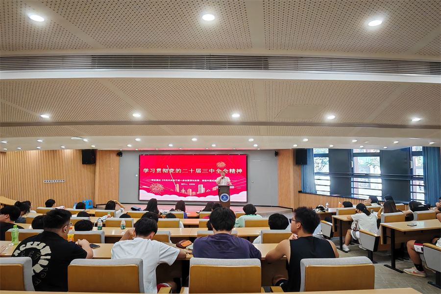 关树基围绕党的二十届三中全会召开背景、基本框架和会议要义等方面作党的二十届三中全会精神专题学习报告。他重点领学了《中国共产党第二十届中央委员会第三次全体会议公报》的主要内容,通过阐述进一步全面深化改革、推进中国式现代化的重大意义和总体要求,带领同学们深刻学习领会全面深化改革的一系列新思想、新观点、新论断,准确把握其科学内涵和实践要求。此外,他通过引用经济特区发展历程,为大家分享改革开放政策的实施给国家经济发展带来的巨大变化和深刻影响,并解读全会精神对社会、法治、国家安全等方面的部署,使同学们从中了解到国家发展的宏观视角与微观细节,学习到了如何在复杂多变的社会变革和全面深化改革,推进中国式现代化机遇中把握时代脉搏,以及如何将个人理想融入国家发展的洪流之中。