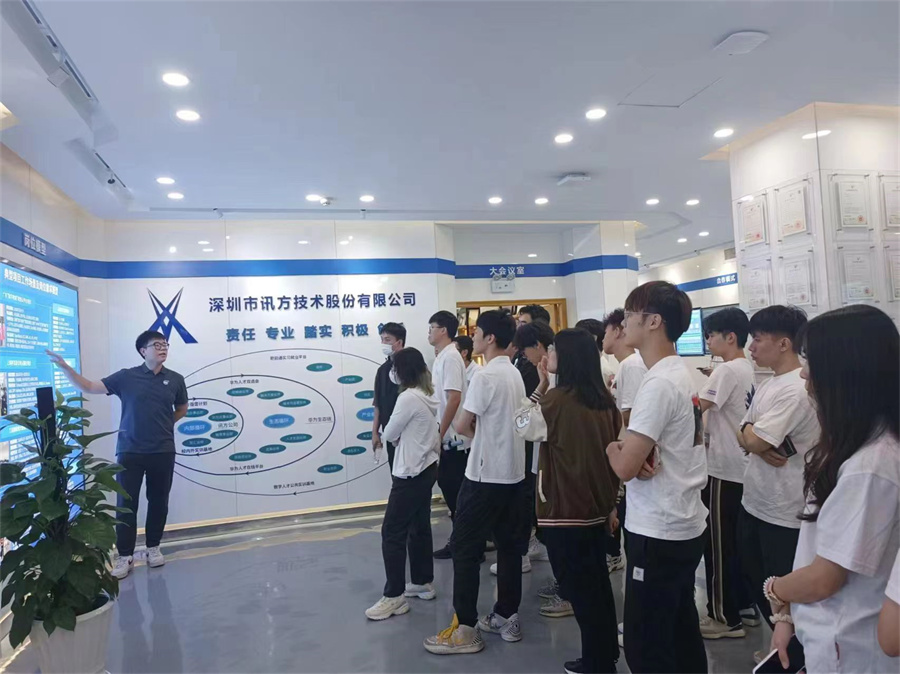 在游学活动中,深圳市讯方技术股份有限公司的工程师代表公司欢迎大家的到来,带领老师和同学们参观公司展厅,讲解公司的历史、现状和发展规划以及公司的主营业务、企业文化和荣誉资质等。在参观过程中,工程师和同学们交流和互动,帮助同学们了解了ICT行业的最新动态和趋势以及公司在市场竞争中的优势和挑战。