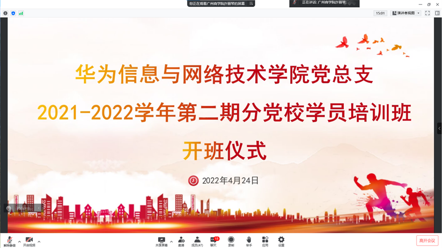 为加强对入党积极分子的培训,提高入党积极分子学习党章党规和最新指导思想的能力,帮助入党积极分子进一步向党组织靠拢。4月24日晚,华为信息与网络技术公司党总支在腾讯会议开展2021-2022学年度第二期分党校学员培训班第一讲,本次党课采用线上授课的方式开展,由华为信息与网络技术公司党总支书记、副经理关树基主讲。员工党支部党员、分党校培训班学员共计49人参与此次课程。